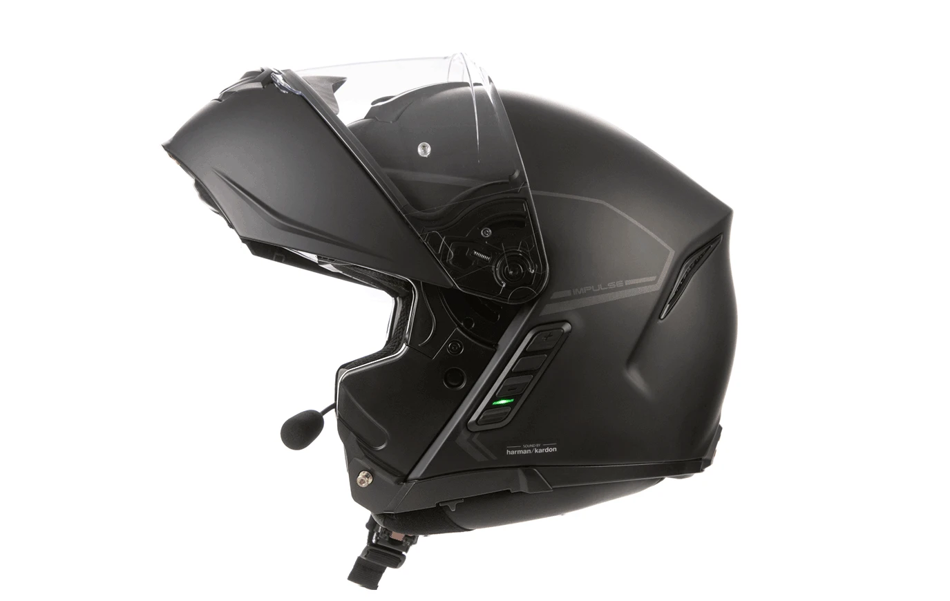 The all-new Impulse is a modular smart helmet featuring Sena’s industry-leading Mesh Intercom™ and Bluetooth® Intercom technology plus premium speakers and microphone by the audio experts at Harman Kardon. With the help of Harman Kardon, the Impulse’s expertly tuned speakers bring a new level of precision and clarity to in-helmet audio, plus an all new microphone for unprecedented outbound audio quality. The helmet boasts an integrated rear-facing taillight for rider visibility and a convenient retractable sun visor. Impulse was built with a DOT and ECE-rated composite fiberglass shell and has an intermediate oval fitment. Four strategically placed vents, a chin vent, top vent, and two exhaust vents allow airflow while riding. Impulse offers the below features: